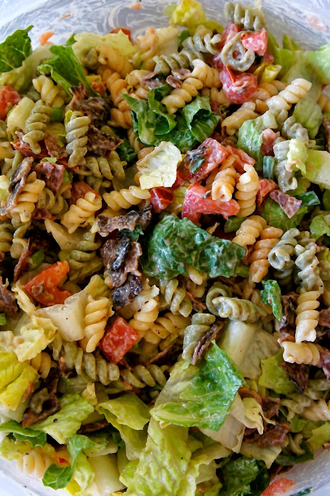This salad has all the goodness of a BLT, except in place of bread there is pasta. Initially this salad is served room temperature, but if there are any leftovers they need to be refrigerated, and I think the cold leftovers taste just as good as it tasted freshly made. Making it a delicious salad perfect for the summer months.